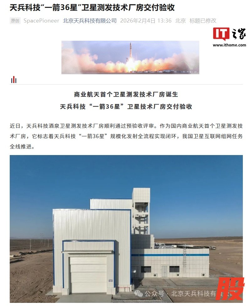 IT之家 2 月 4 日消息,北京天兵科技有限公司今日发文宣布,酒泉卫星测发技术厂房近日顺利通过预验收评审,标志着天兵科技“一箭 36 星”规模化发射全流程实现闭环,我国卫星互联网组网任务全线推进,是国内商业航天首个卫星测发技术厂房。