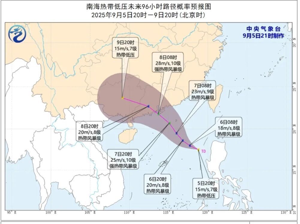 在9月5日20时,南海一热带扰动增强为热带低压,位于距离珠海东南方向约760公里的海上,预计其将以每小时10—15公里的速度向西偏北方向移动,强度逐渐加强。
